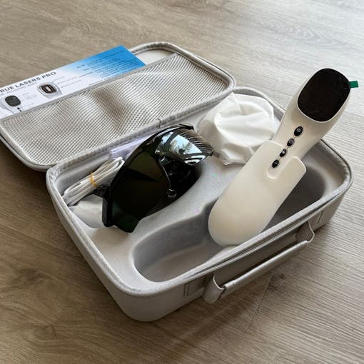 ☑ Laser Pain Relief Combination Device ☑ Laser cover for hands-free use ☑ Medium and large strap sizes ☑ Protective safety glasses ☑ USB charging cord ☑ Cleaning cloth ☑ Traveling Case ☑ Dr. Amy’s True Lasers Treatment Protocol Manual