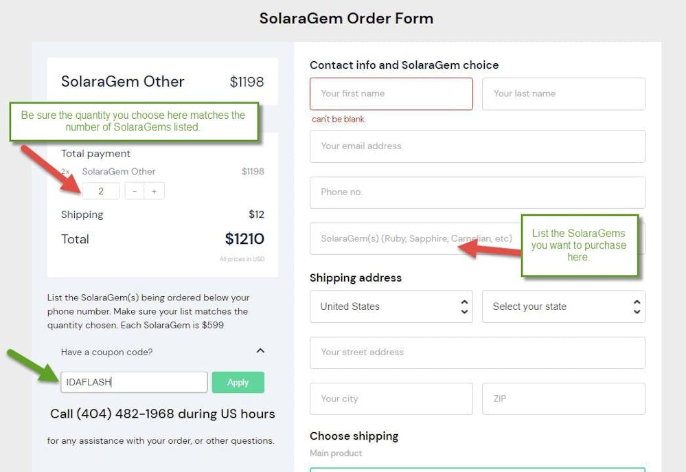 Choose how many SolaraGems you want, and then list them by name in the field below your phone number. See the image below for some detailed instructions on how to do this. It also shows where to enter your coupon code. (Note that the code in the picture is not the one you will use)